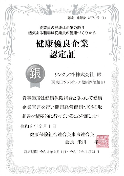 リンクラフト株式会社は、令和8年2月1日付で健康優良企業「銀の認定」を更新いたしました。